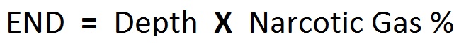 The END for an 18/45 Trimix at 60m would be worked out as follows. 60m = 7 atm. The fraction of narcotic gas in 18/45 mix would be 0.55. The END is 3.85 ata or 28.5m.