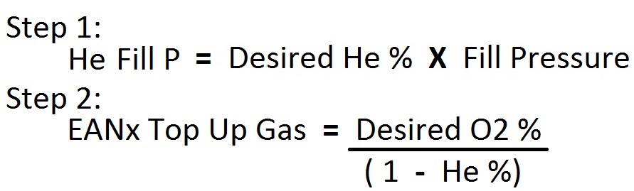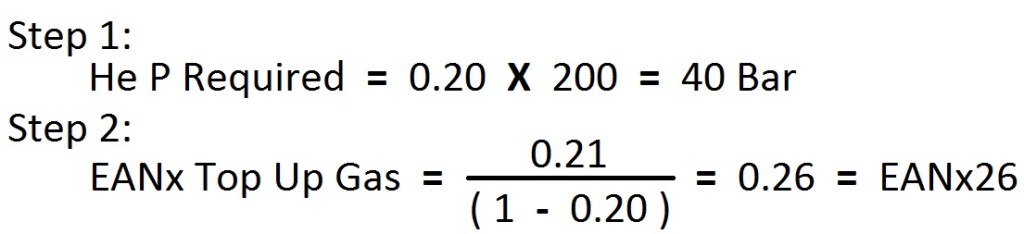 Having a target mix of 21/20 filled to 200 Bar, we would need to add 40 Bar of He and use EANx26 to top up to 200 Bar. Alternatively, we could add 10 Bar of Oxygen, 40 Bar of Helium and top up to 200 Bar with air. The calculations would look like this: