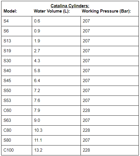 - Cylinder Model, Water Volume and Working Pressure Charts